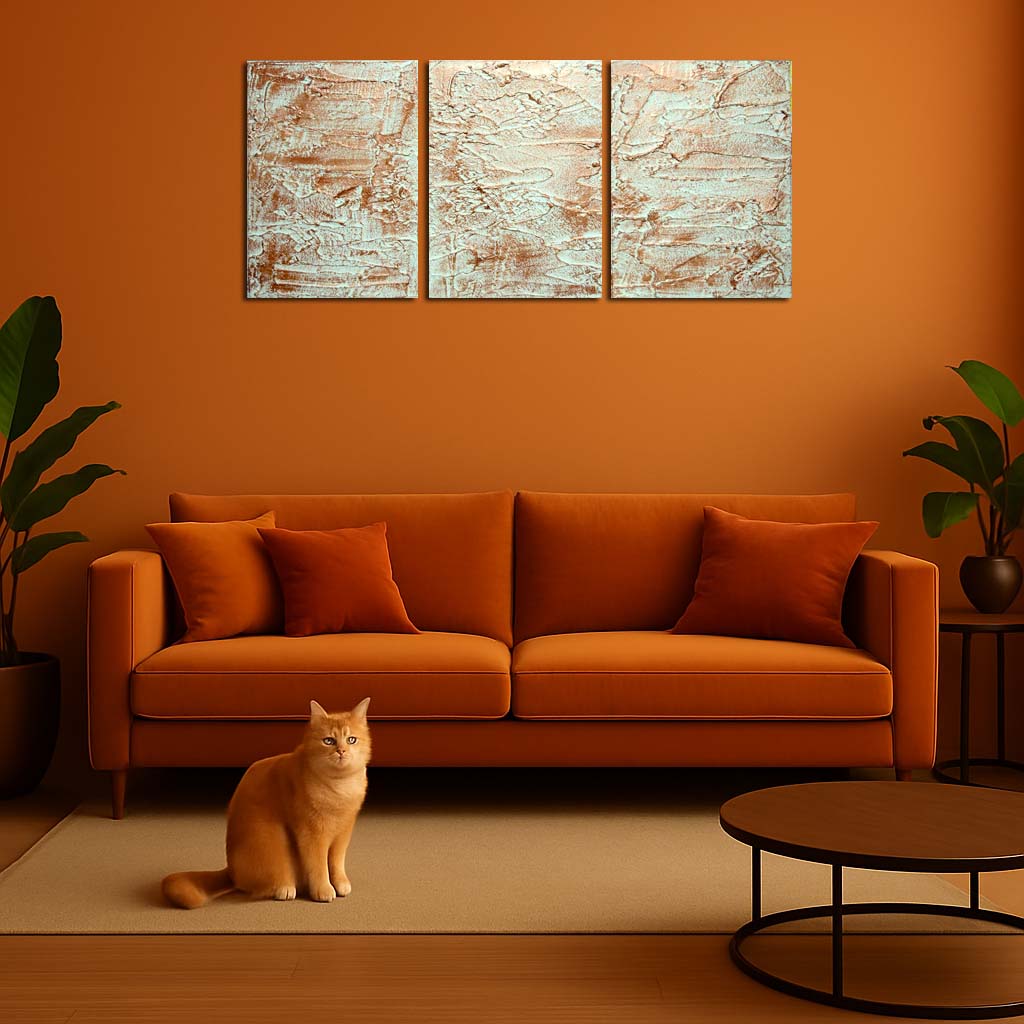 copper wall abstract on canvas in a triptych style " Lavish Copper " oversized metal wall art