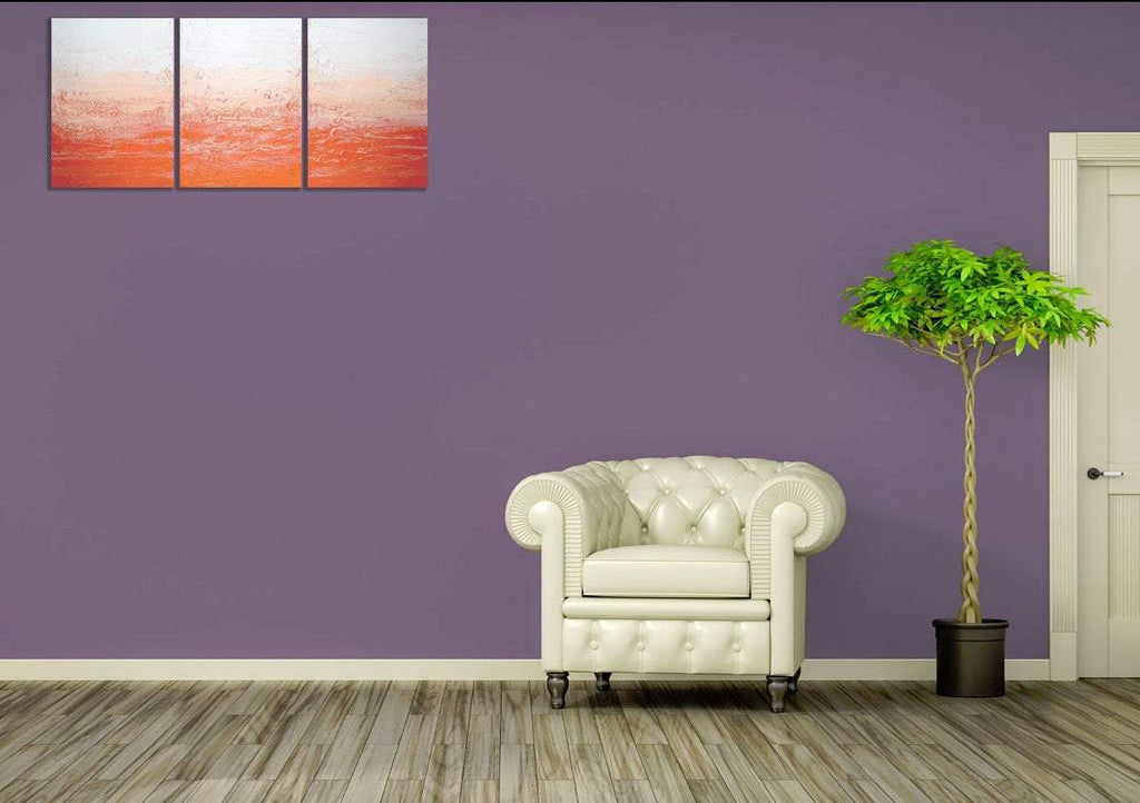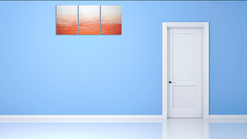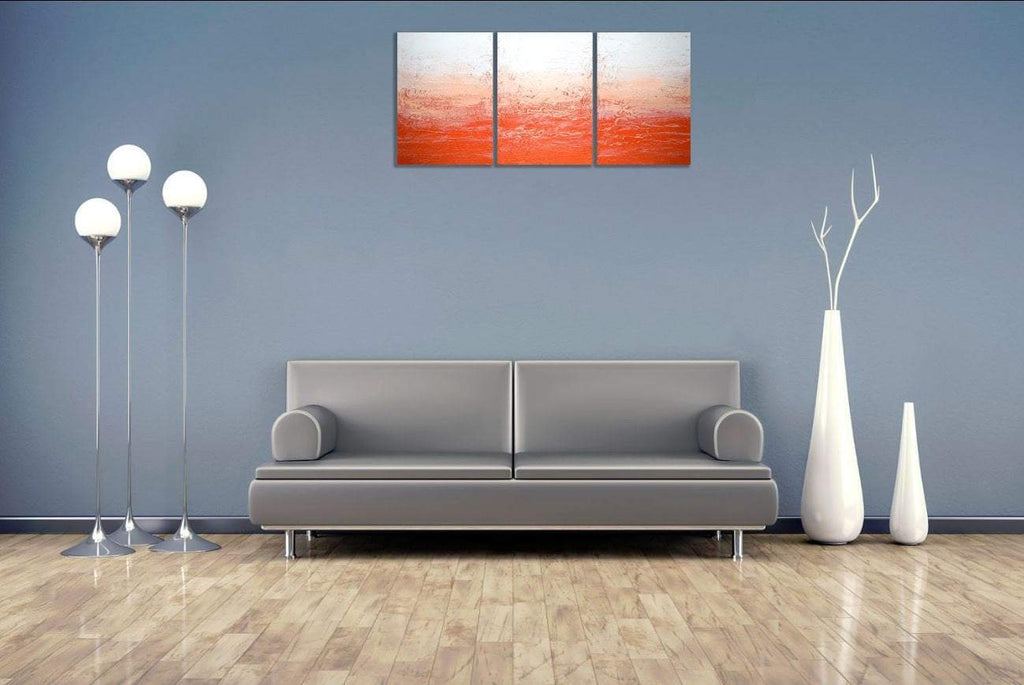 Triptych painting on canvas wall art in shades of orange and white, this painting has lots of thick texture. This is a large painting available in 4 sizes