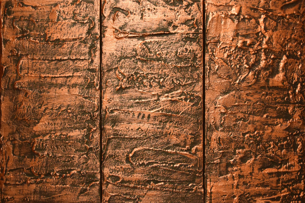 This powerful triptych is a striking example of modern texture and metallic depth, designed to command attention in any setting. Layers of rich copper tones flow across the canvas with a tactile, almost sculptural surface that catches and reflects light differently throughout the day. The result is a dynamic presence that feels both ancient and contemporary/